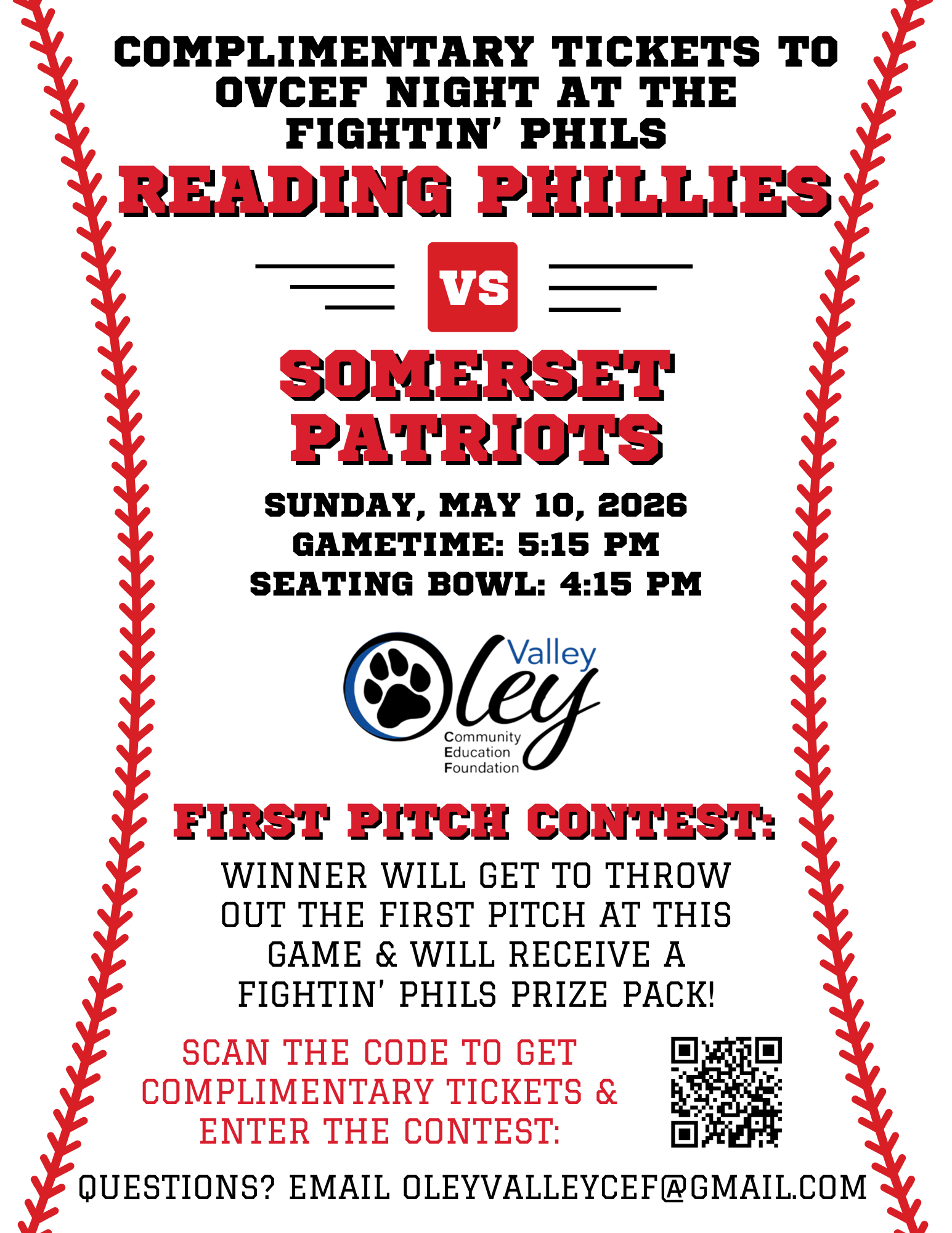 Get ready for a home-run night of fun with OVCEF! ⚾🎉 We’re heading to the ballpark for OVCEF Night at the Reading Fightin’ Phils as they take on the Somerset Patriots—and you’re invited! Enjoy complimentary tickets, an electric game-day atmosphere, and a chance to be part of the action with our First Pitch Contest, where one lucky winner will throw out the first pitch and score a Fightin’ Phils prize pack. It’s the perfect mix of baseball, community, and fun—scan the code, grab your tickets, and come cheer with us for an unforgettable night at the park!