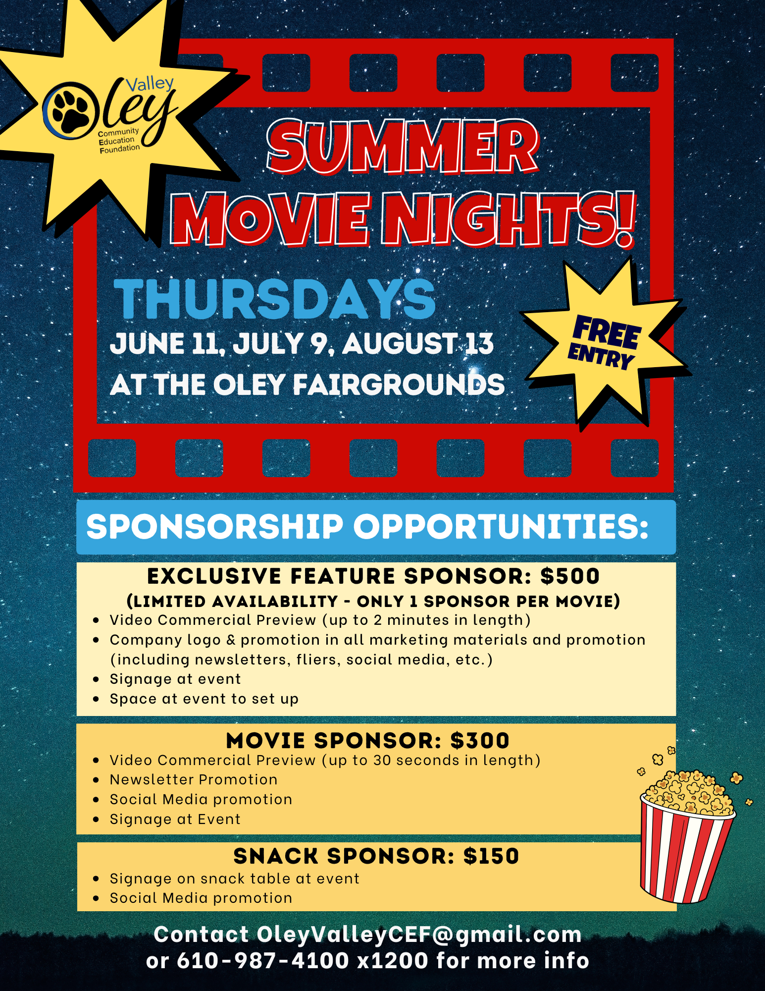 We’re currently looking for Summer Movie Night Sponsors! Sponsorship support allows us to offer these family-friendly movie nights free to attend, while also providing fun pre-movie activities and snacks for families to enjoy. It’s a great opportunity for local businesses and organizations to gain visibility, connect with the community, and support meaningful programs that benefit students and families in the Oley Valley. If you’re looking for a fun, feel-good way to give back this summer, we’d love to partner with you to help create memorable nights under the stars.